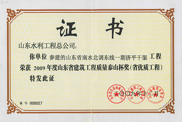 公司"山东省南水北调东线一期济平干渠工程"荣获2009年度山东省建筑工程质量泰山杯