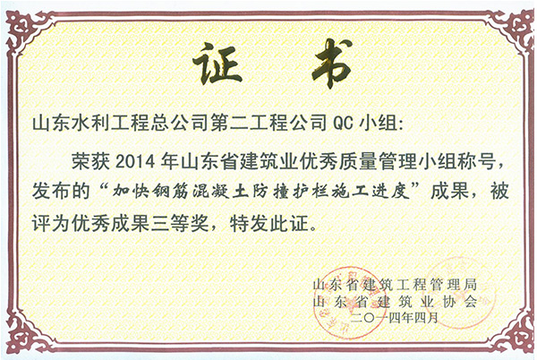 公司“加快钢筋混凝土防撞护栏施工进度”荣获2014年山东省建筑业优秀质量管理优秀成果三等奖