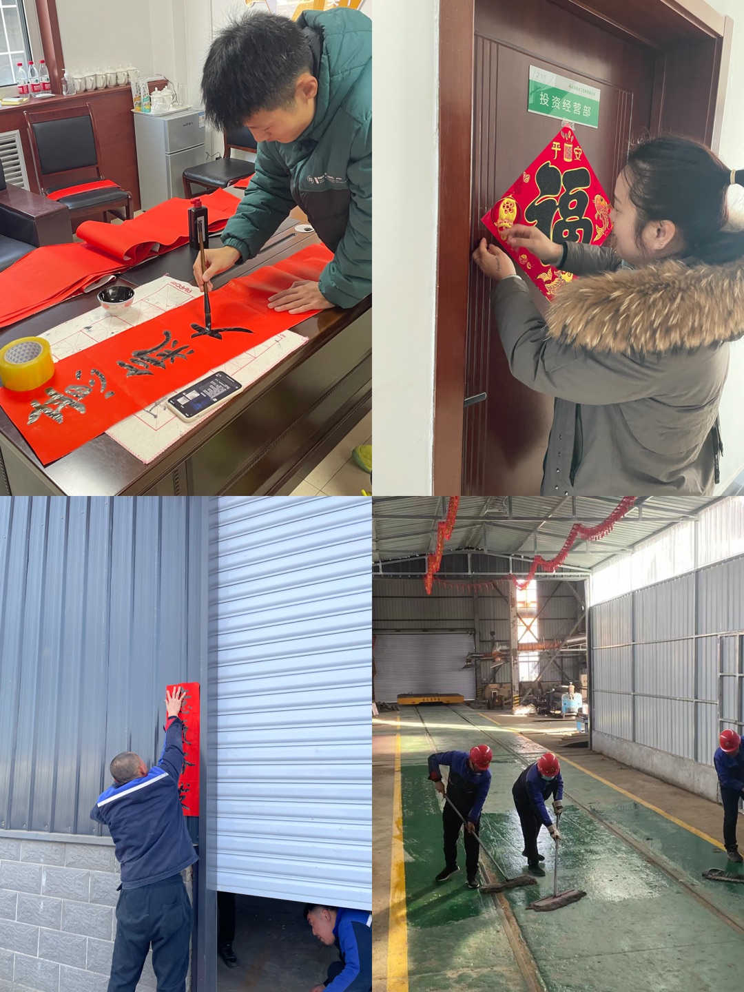 活动中,水工机械公司的职工们在厂房门前挂上火红的灯笼,贴上职工们亲手书写的春联。全体员工齐动手,将公司里里外外打扫的整洁干净,焕然一新,营造了浓浓的节日气氛。