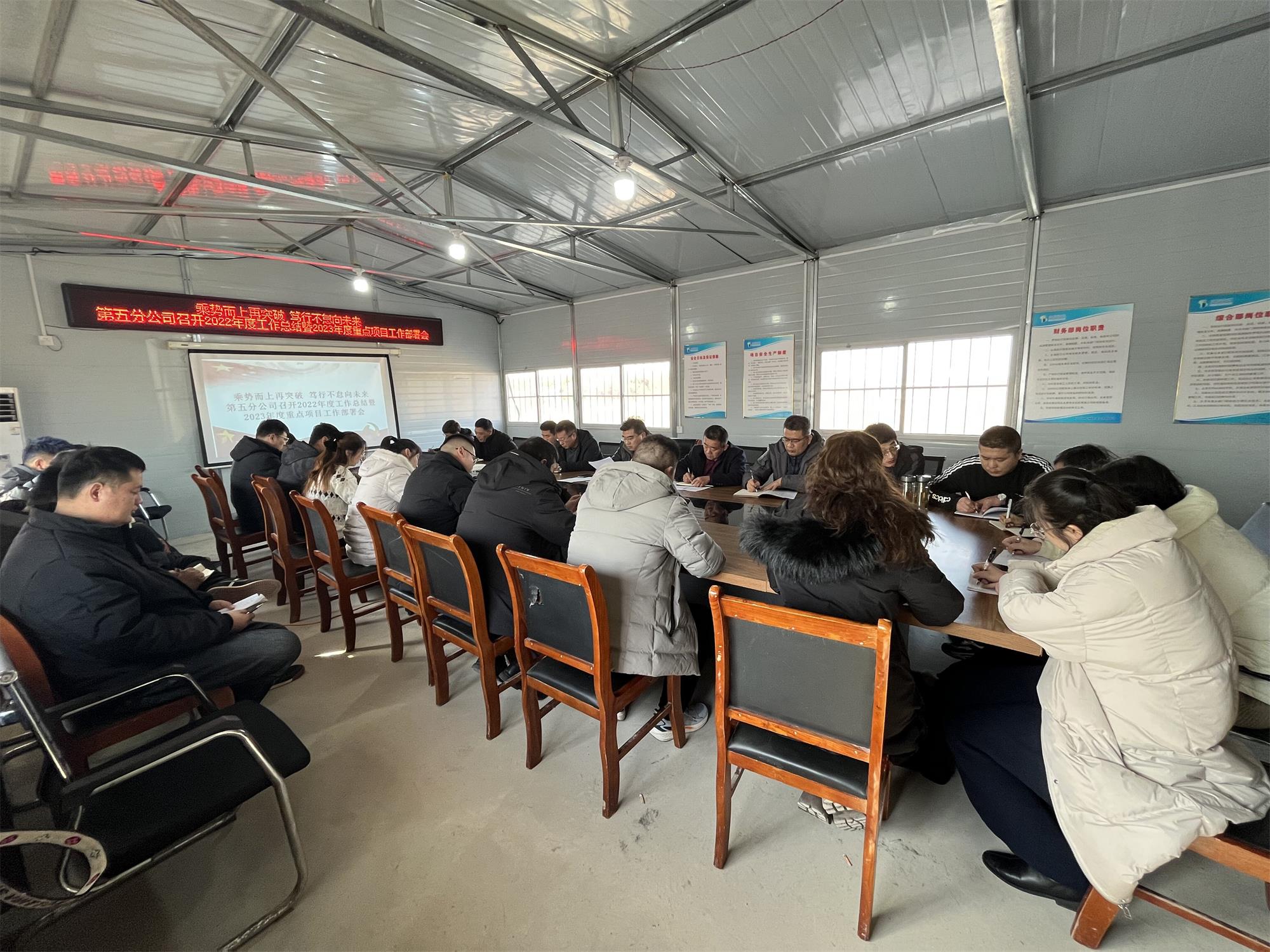 1月30日,第五分公司在无棣黄瓜岭项目部召开2022年度工作总结暨2023年度重点项目工作部署会议,上好“开工第一课”。公司在鲁职工参加会议,会议由党支部书记、总经理蔡国森主持。