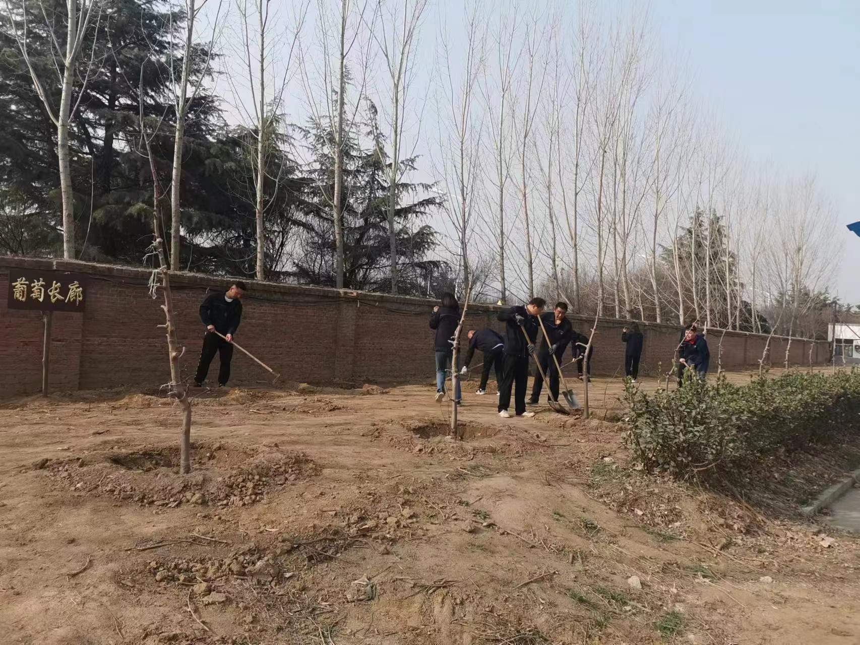 植树现场,大家互相配合,掘坑、扶树、培土,浇水,忙得不亦乐乎。新栽种的200多棵黄金维纳斯和精品红富士苹果树苗、30多棵葡萄树苗、10多棵桃树、月季花卉等为水总曲阜基地再添一片新绿。今年开春以来,建筑劳务公司以划分责任区为单位对曲阜驻地绿地上死亡、损缺、老化的植物进行全面检查,进一步将春季绿化任务细化,责任到人。同时积极行动,通过挖掘机移栽、人工挖运等方式协调大量绿化植被,组织员工们在驻地内栽种。