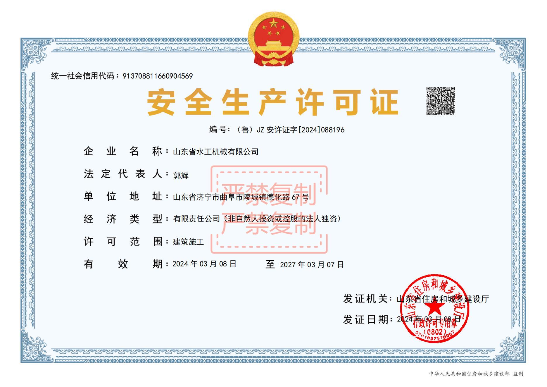 一季度,水工机械公司制定《山东省水工机械有限公司重要事项督办管理办法》对公司年度及日常各项重要事项进行督办并及时调整工作计划和措施,确保公司各项工作稳步推进。2023年12月底取得钢结构工程专业承包贰级资质,2024年3月7日取得安全生产许可证,为公司进一步拓展业务,持续保障安全生产打下基础。