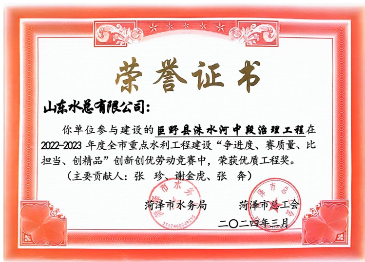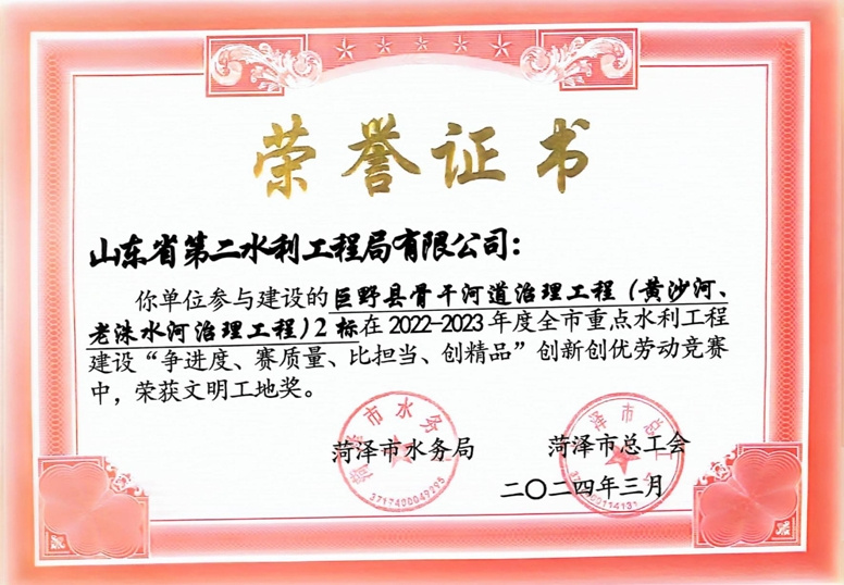 近日,菏泽市水务局、菏泽市总工会公布了“2022-2023年度全市重点水利工程建设“争进度、赛质量、比担当、创精品”创新创优劳动竞赛”获奖名单,公司及权属单位二局有限公司共荣获优质工程1项、文明工地2项、QC成果1项,优秀项目经理1项。