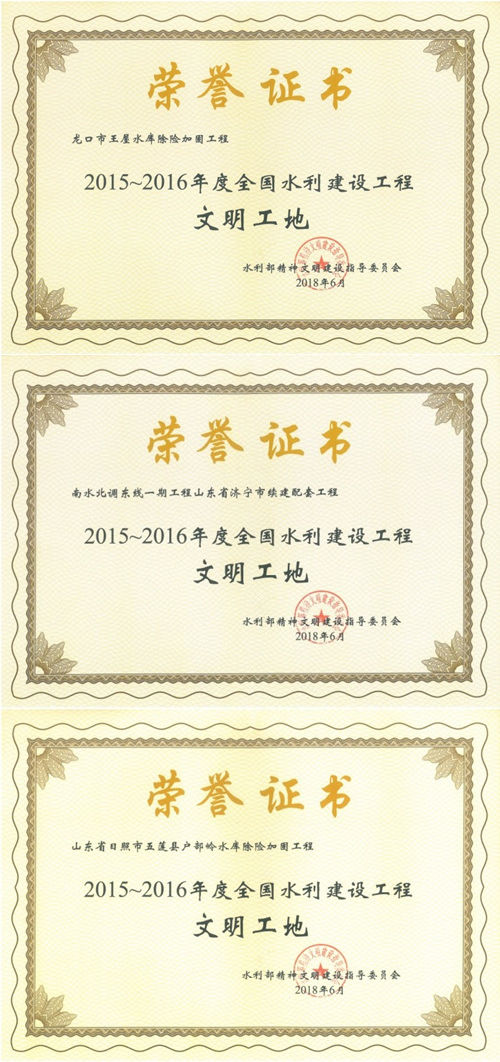 公司“龙口市王屋水库除险加固工程”等项目荣获“2015-2016年度全国水利建设工程文明工地”称号